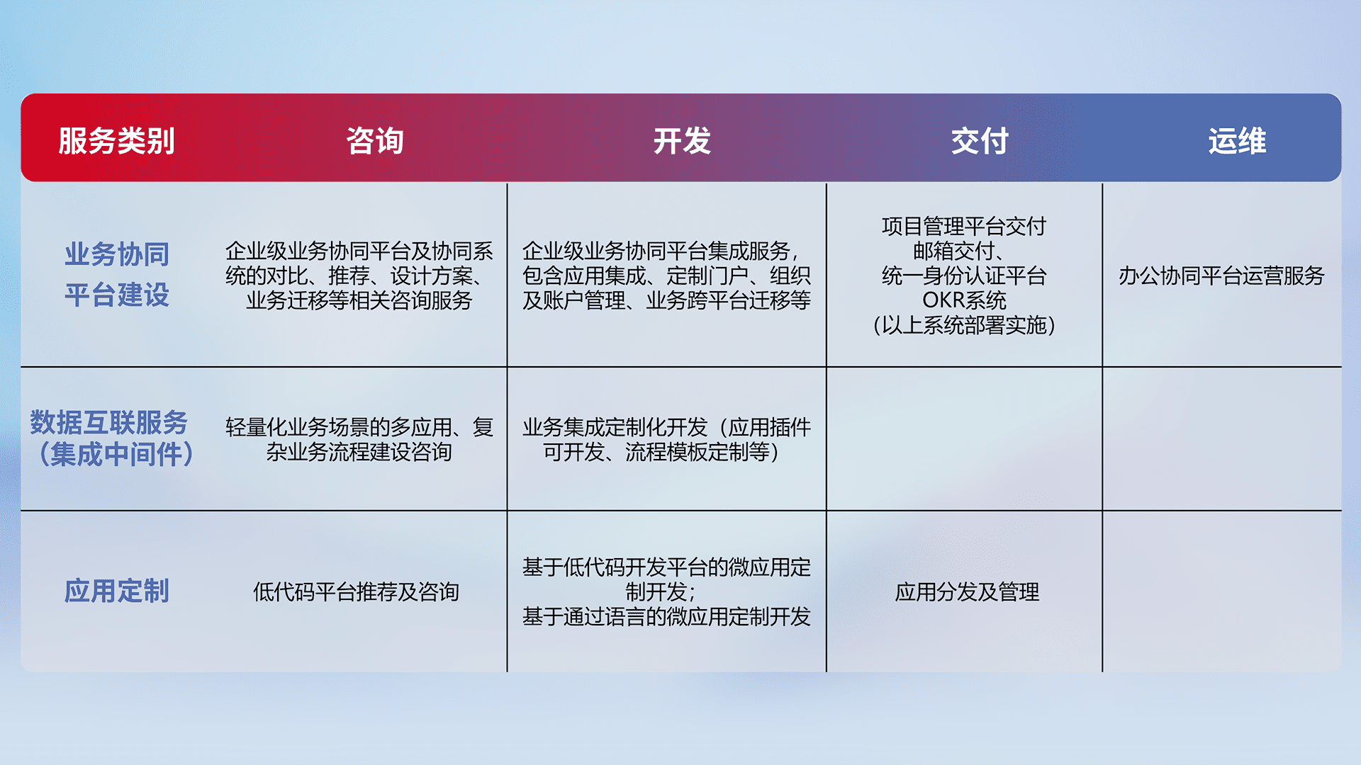 针对钉钉、、企微、、IDaas等平台级产品提供产品的规划、、方案、、交付、、定制化开发等服务,,实现如统一协同办公、、智能客户服务、、混合会议管理、、、智能数据查询、、、、等业务场景,,,实现数字化转型。。