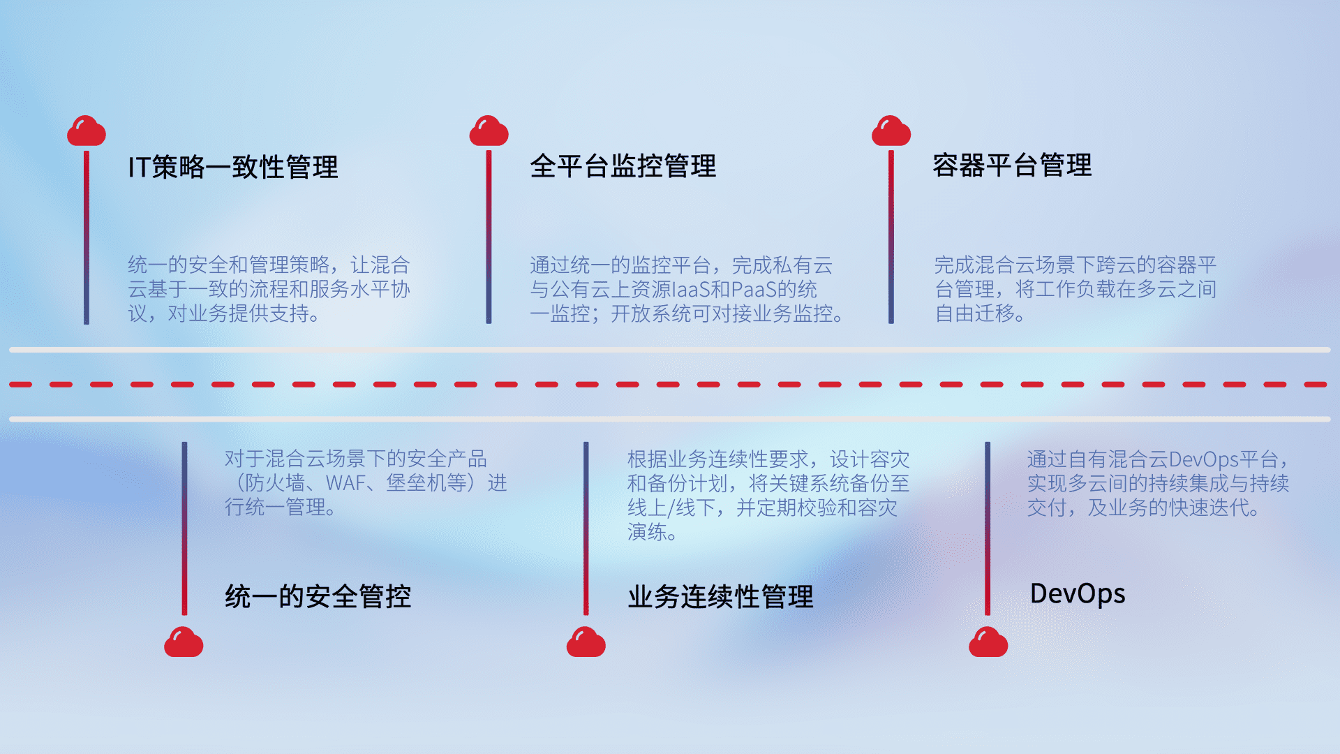 通过多云纳管,,,以统一的资源数据模型把客户的云资源进行抽象和封装,,,进而实现对多云资源的统一操作,,,,保障云资源管理的可靠性、、、稳定性与可用性。。。。量身定制化运维内容,,,配置、、开发运维、、、补丁管理、、、备份、、、、监控、、、、认证和访问管理、、、、审计和日常巡检等,,,保障在用云过程中的可靠度,,,,稳定度以及高可用率。。。。