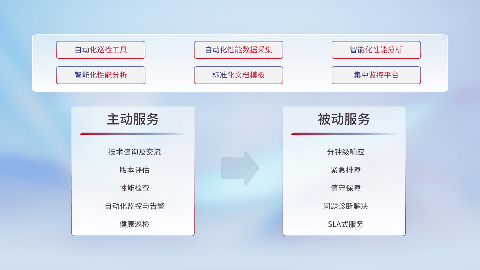 智能化工具和标准化文档,,,,保障服务质量,,,提供主动服务(包含技术咨询、、版本评估、、、性能检查、、、、自动化监控与告警、、健康巡检)和被动服务包含(分钟级响应、、紧急排障、、值守保障、、、、问题诊断解决、、、、SLA服务)。。。。